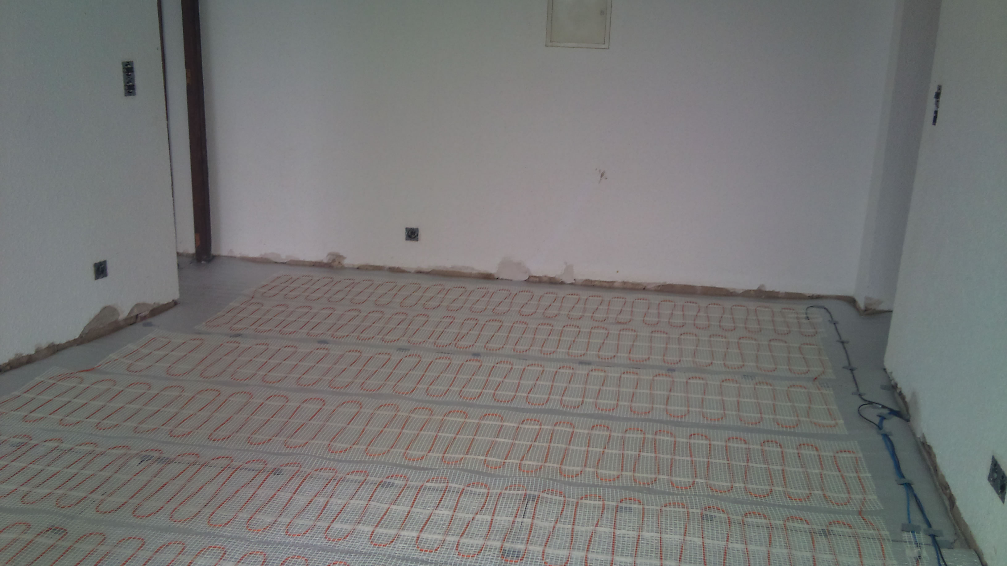 Verlegte Heizmatten auf Isoliermaterial - Gesamte Höhe etwa 1 cm Collocated heating nets on insulation - Total hight about 1 cm Mallas colocadas encima de placas aislamiento - Alura completa ca. 1 cm